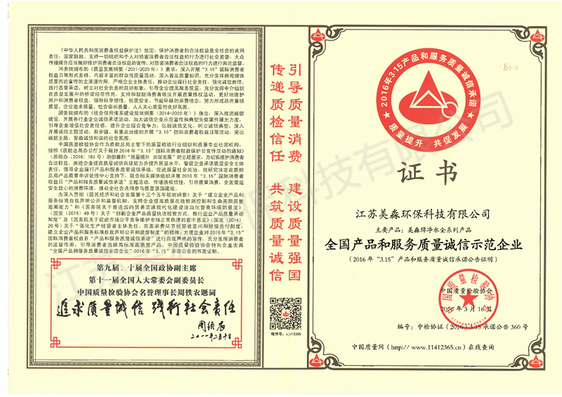 2016年全國產品和服務質量誠信示范企業(yè)-凈水全系列產品
